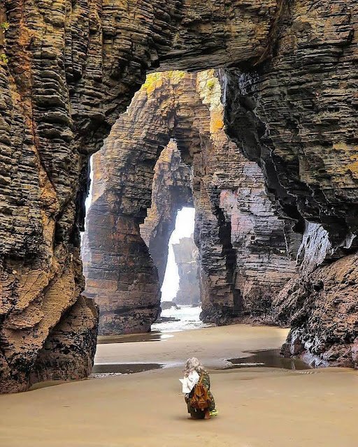 What to see: Massive slate and schist arches up to ~30 meters high, sea caves, and the sand corridors that appear at low tide. The best experience is walking the beach at low tide to explore the formations.